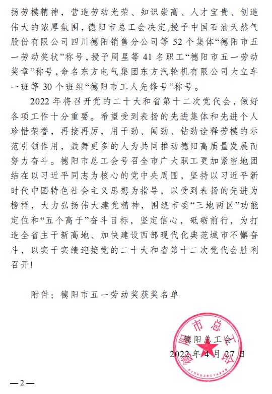 在4月27日德阳市总工会文件中,四川中衡检测技术有限公司在《关于表扬德阳市五一劳动奖和命名工人先锋号的通报》里,受到了“德阳市五一劳动奖状”的表彰。