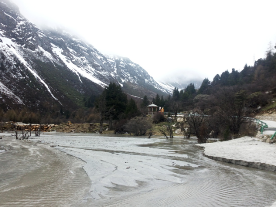 从景区门口到第一个景点相距20多公里,共33个急弯道,乘坐观光大巴上去,司机大叔的车技了得,被我们戏称为“秋名山车神”??墒蔷」?ldquo;车神”车技了得,那33道急弯的威力依然不容小觑,毫无悬念的,我们的小伙伴部分晕车了。所幸,不严重。下车,到达景区,看到大雪山的那一刻便激动了,于是开启了我们拍拍拍的模式,一路走一路拍,上山的路上飘着小雪。