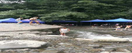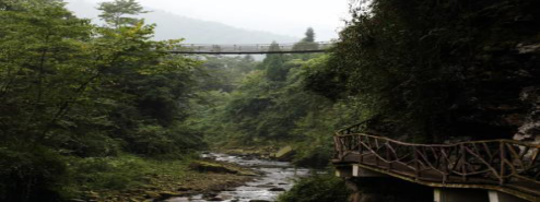 又有清流激湍,映带左右,景区内之商民,借其独有之地势,顺势而造,引潺潺山泉作纳暑之曲水。吾众列坐其次;俯视眼下清泉,叮咚叮铃之流水,荡人心涤。此水时而平静蓄势,行至陡壁或回环处,犹如百舸争流,争先恐后,形成水花一朵朵,似那春日满山桃花开,烂漫一幕幕。