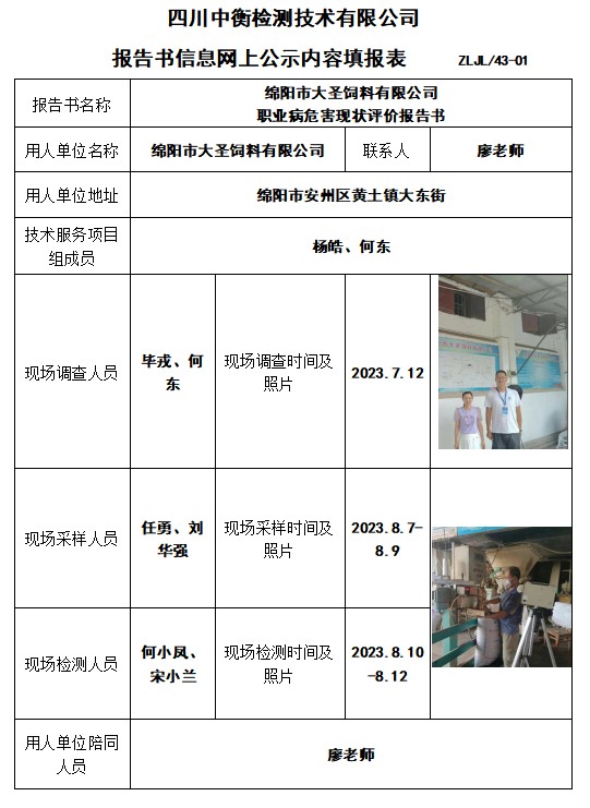 绵阳市大圣饲料有限公司 职业病危害现状评价报告书