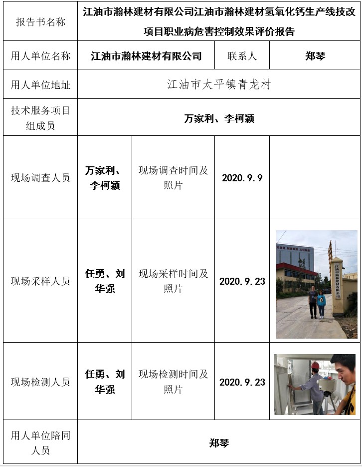 江油市瀚林建材有限公司江油市瀚林建材氢氧化钙生产线技改项目职业病危害控制效果评价报告