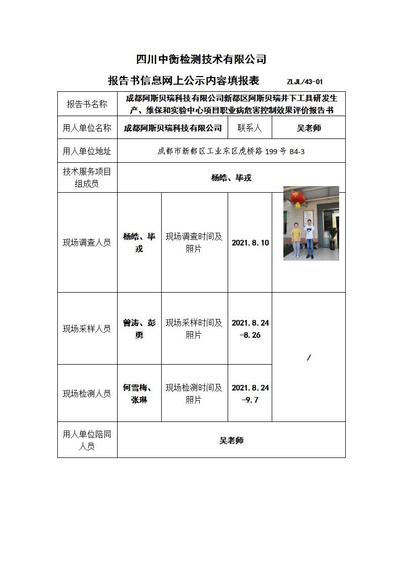 成都阿斯贝瑞科技有限公司新都区阿斯贝瑞井下工具研发生产、维保和实验中心项目职业病危害控制效果评价报告书