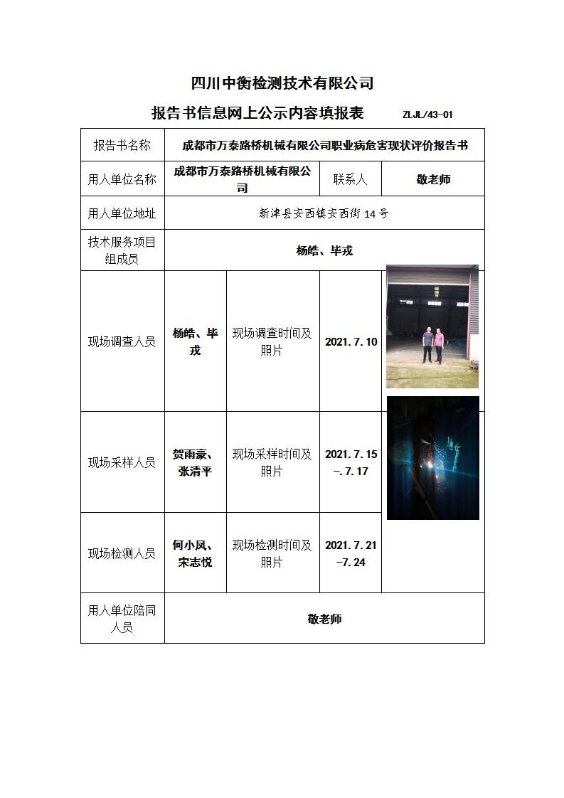 成都市万泰路桥机械有限公司职业病危害现状评价报告书