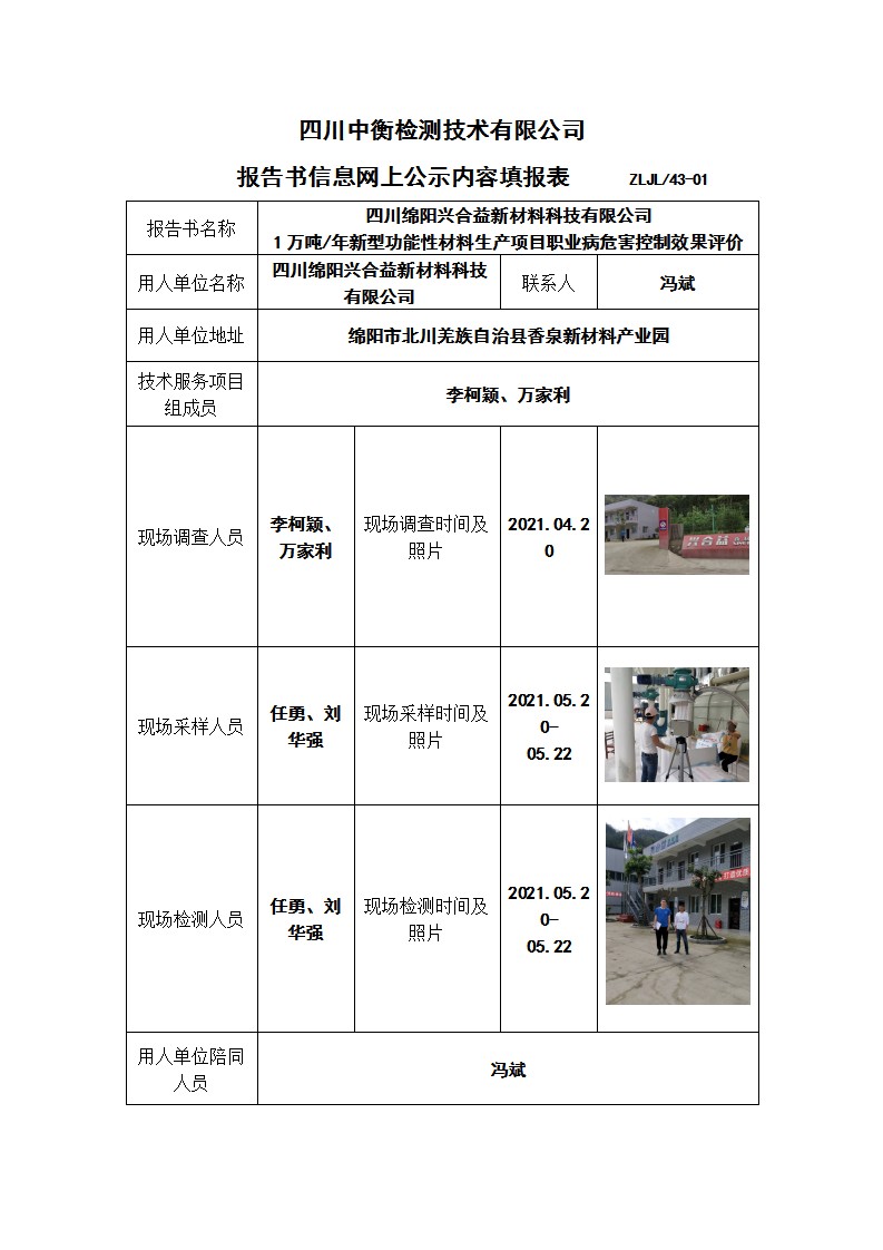 四川绵阳兴合益新材料科技有限公司 1万吨/年新型功能性材料生产项目职业病危害控制效果评价