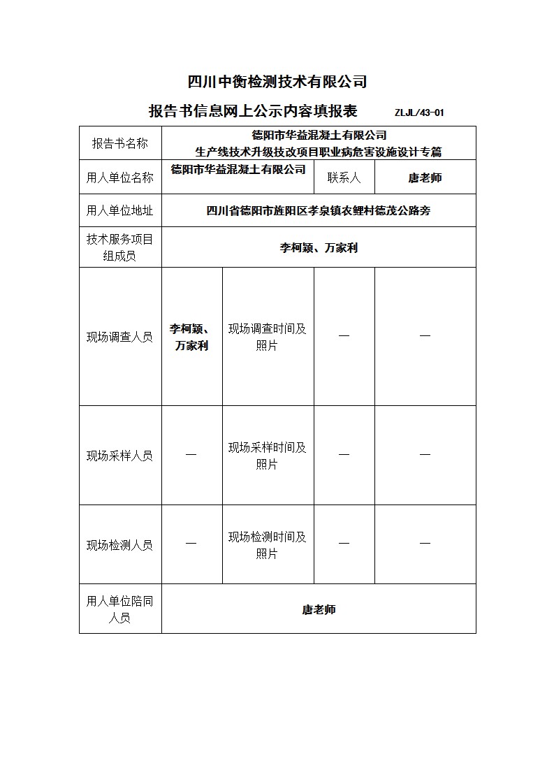 德阳市华益混凝土有限公司 生产线技术升级技改项目职业病危害设施设计专篇
