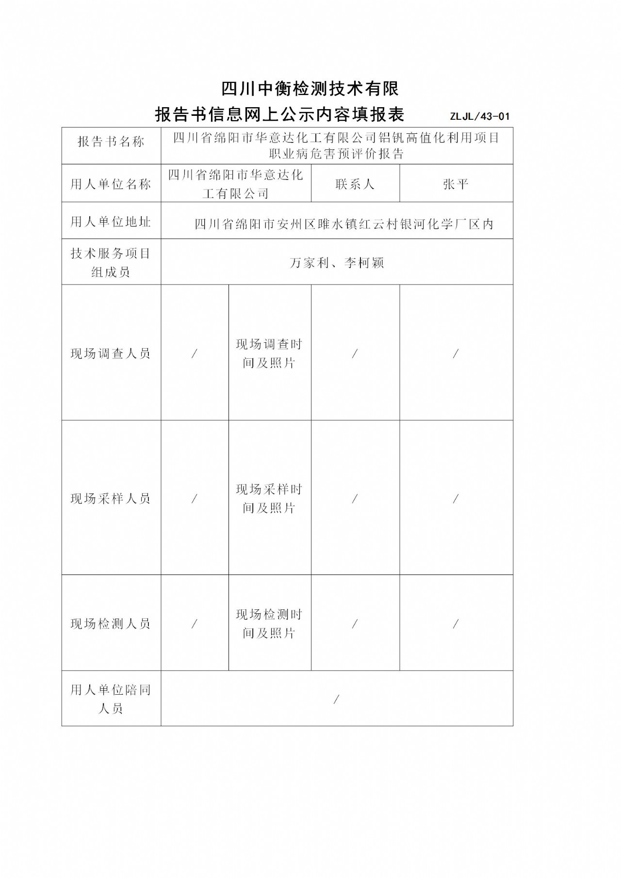四川省绵阳市华意达化工有限公司铝钒高值化利用项目职业病危害预评价报告