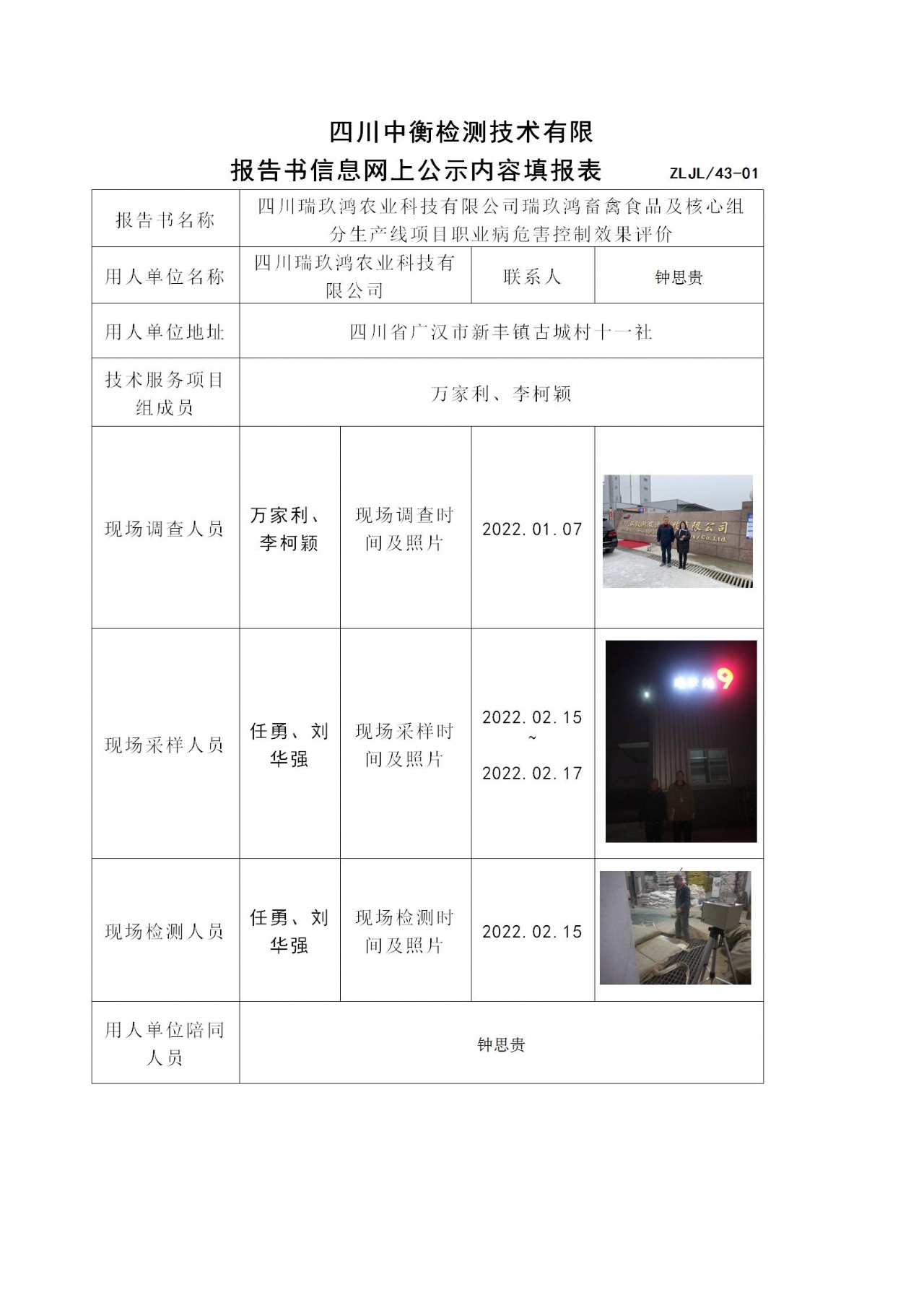 四川瑞玖鸿农业科技有限公司瑞玖鸿畜禽食品及核心组分生产线项目职业病危害控制效果评价