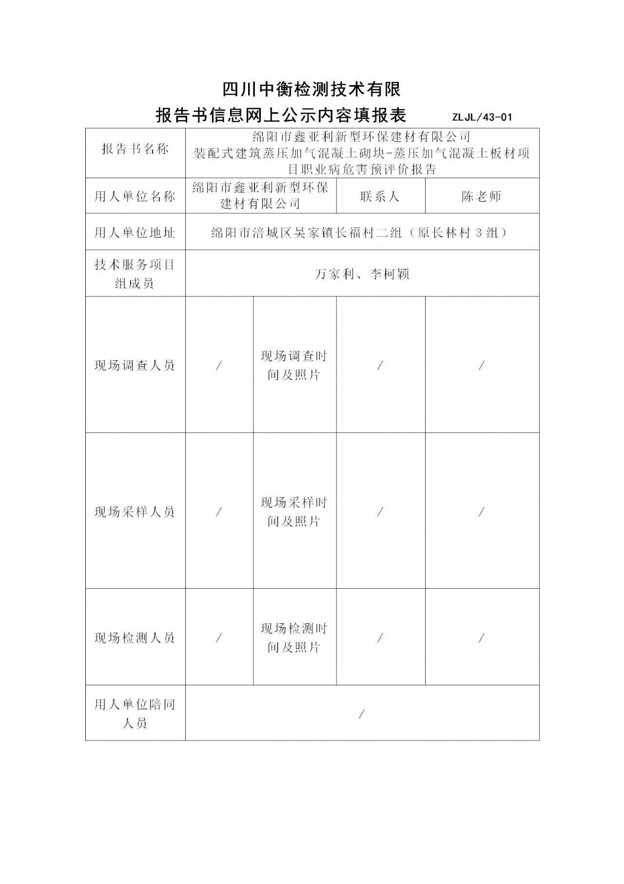 绵阳市鑫亚利新型环保建材有限公司 装配式建筑蒸压加气混凝土砌块-蒸压加气混凝土板材项目职业病危害预评价