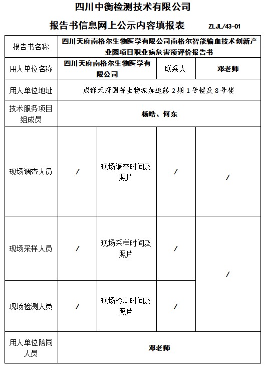 四川天府南格尔生物医学有限公司南格尔智能输血技术创新产业园项目职业病危害预评价