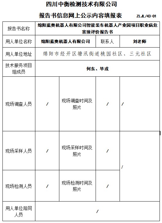 绵阳蓝奥机器人有限公司智能装车机器人产业园项目职业病危害预评价