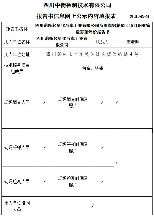 四川蔚瓴轻量化汽车工业有限公司商用车铝箱加工项目职业病危害预评价