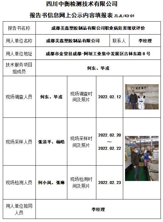 成都美鑫塑胶制品有限公司职业病危害现状评价