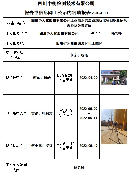 四川泸天化股份有限公司工业氨水充装系统优化项目职业病危害控制效果评价