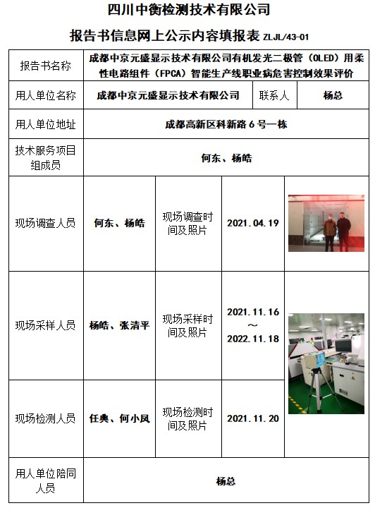 成都中京元盛显示技术有限公司有机发光二极管(OLED)用柔性电路组件(FPCA)智能生产线职业病危害控制效果评价