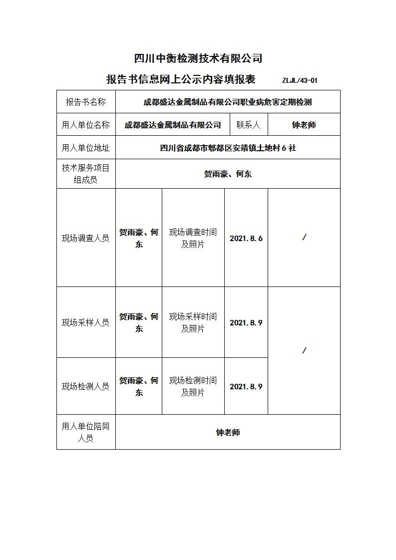 成都盛达金属制品有限公司职业病危害定期检测