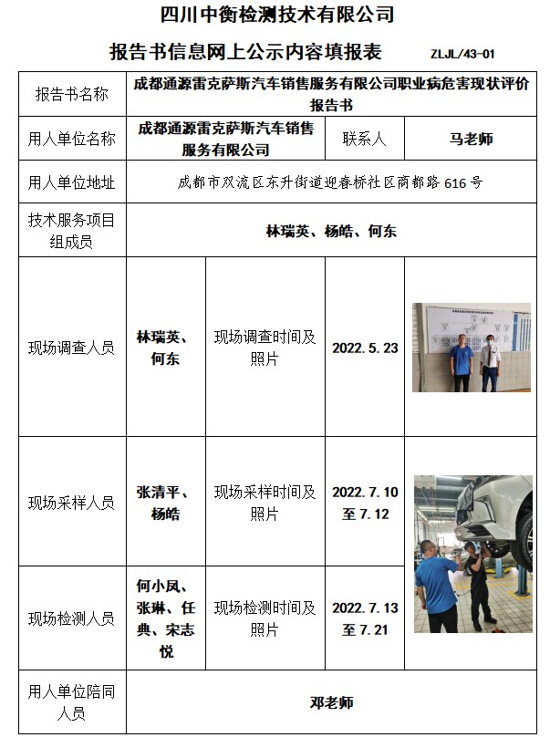 成都通源雷克萨斯汽车销售服务有限公司职业病危害现状评价