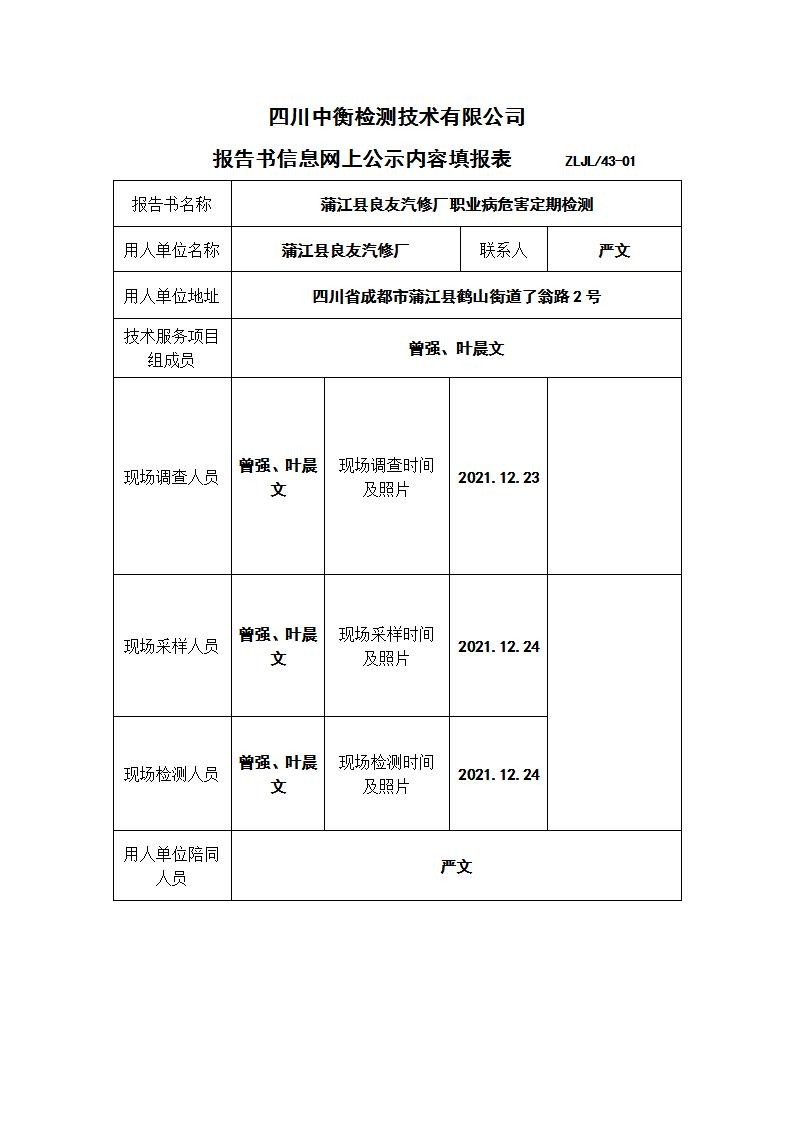 蒲江县良友汽修厂职业病危害定期检测