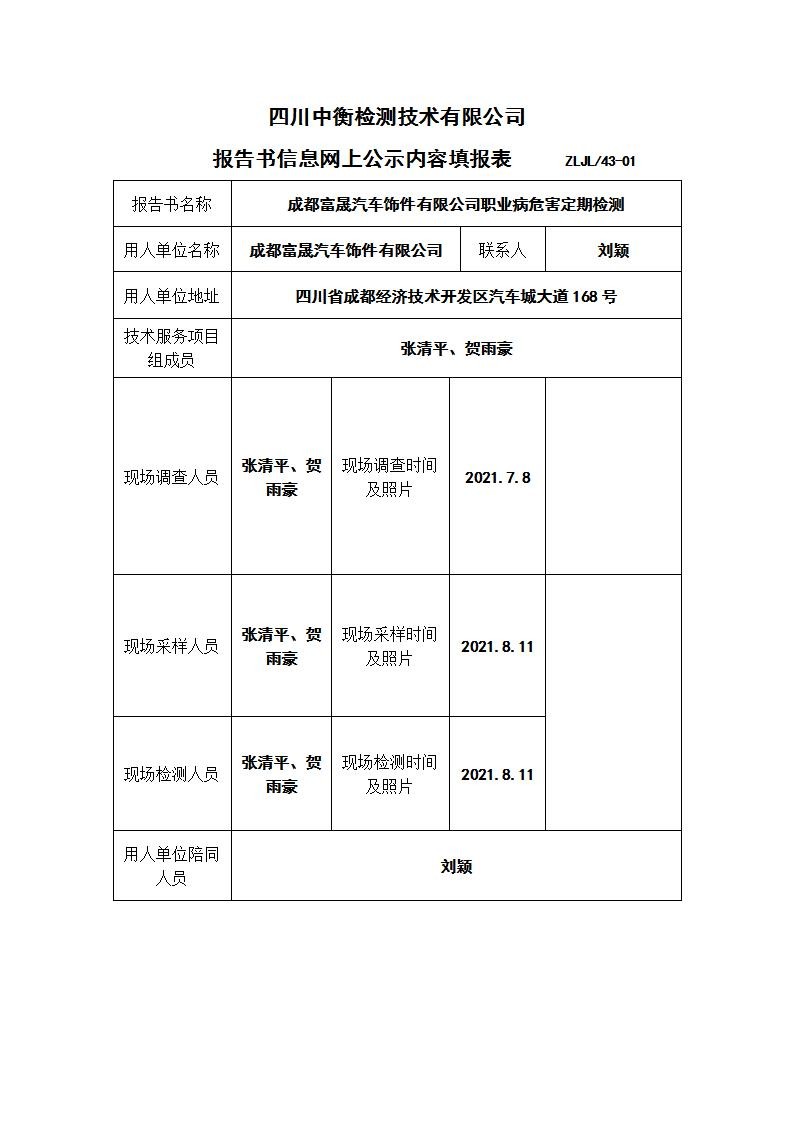 成都富晟汽车饰件有限公司职业病危害定期检测