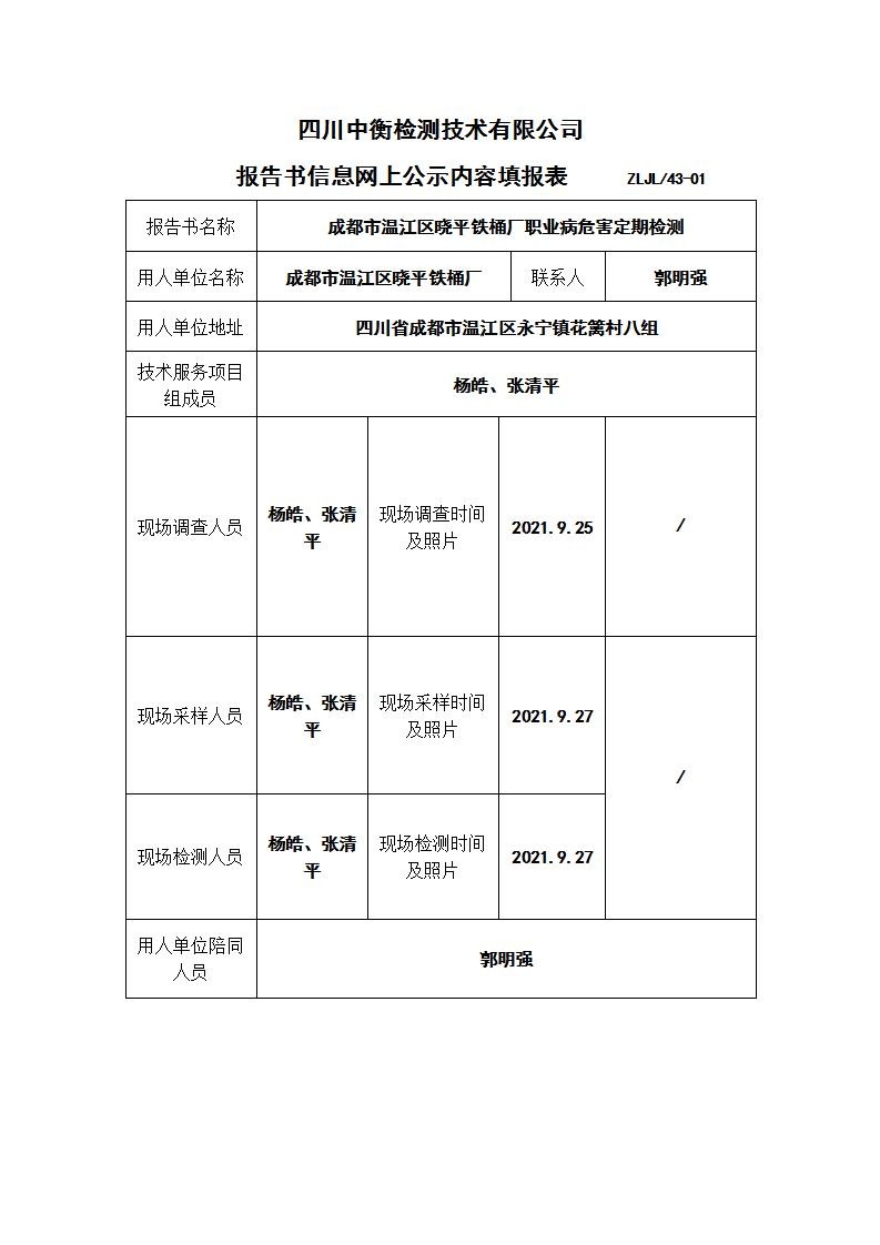 成都市温江区晓平铁桶厂职业病危害定期检测