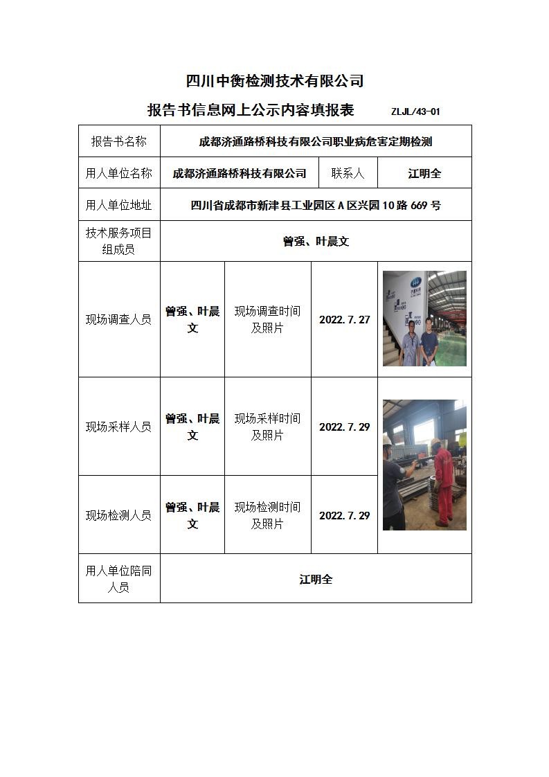 成都济通路桥科技有限公司职业病危害定期检测