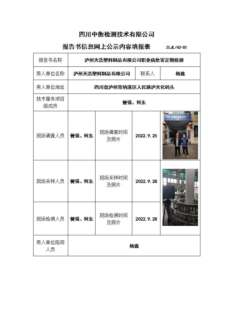 泸州天浩塑料制品有限公司职业病危害定期检测