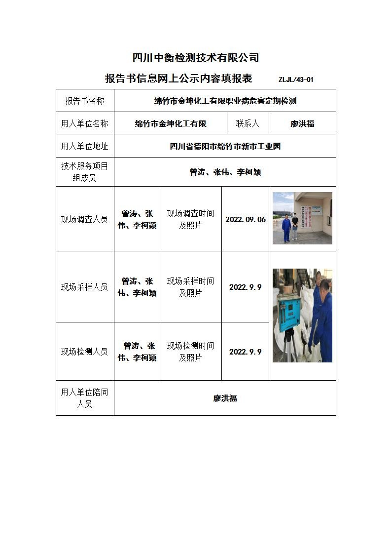 绵竹市金坤化工有限公司职业病危害定期检测