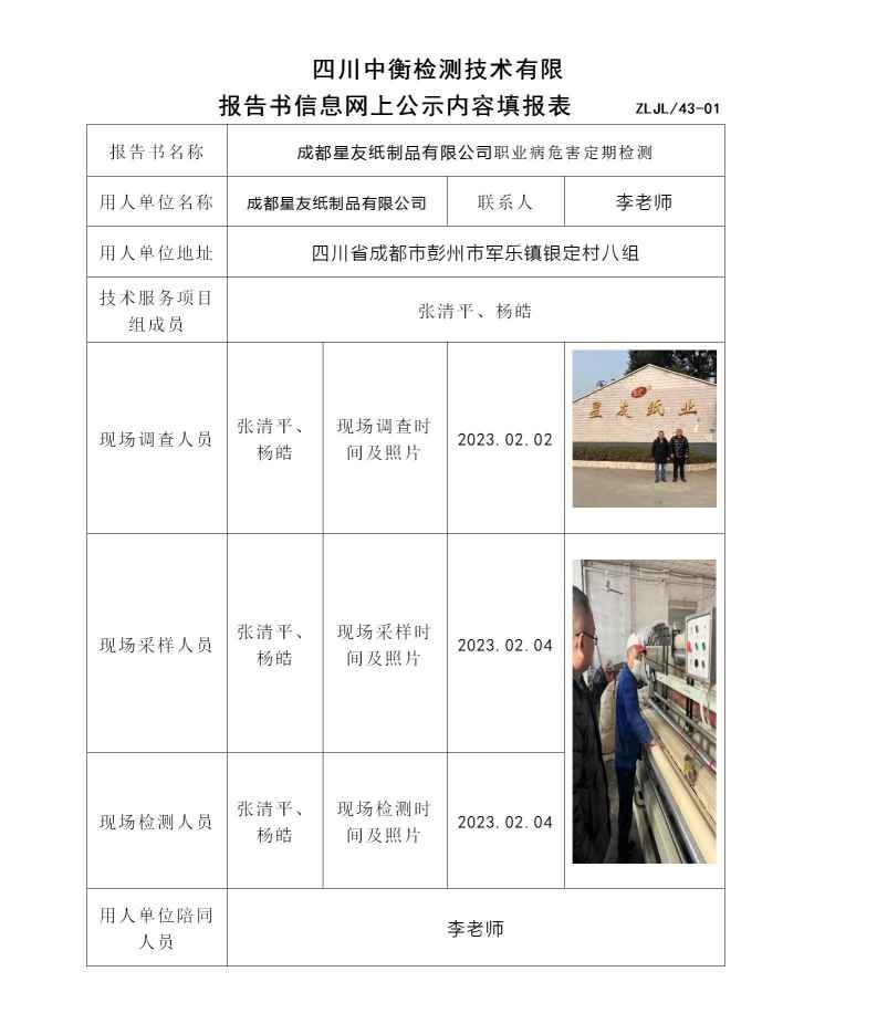 成都星友纸制品有限公司职业病危害定期检测