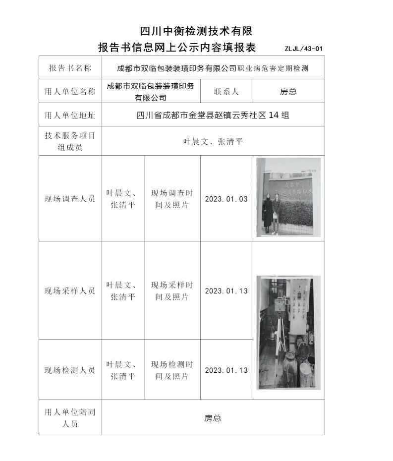 成都市双临包装装璜印务有限公司职业病危害定期检测