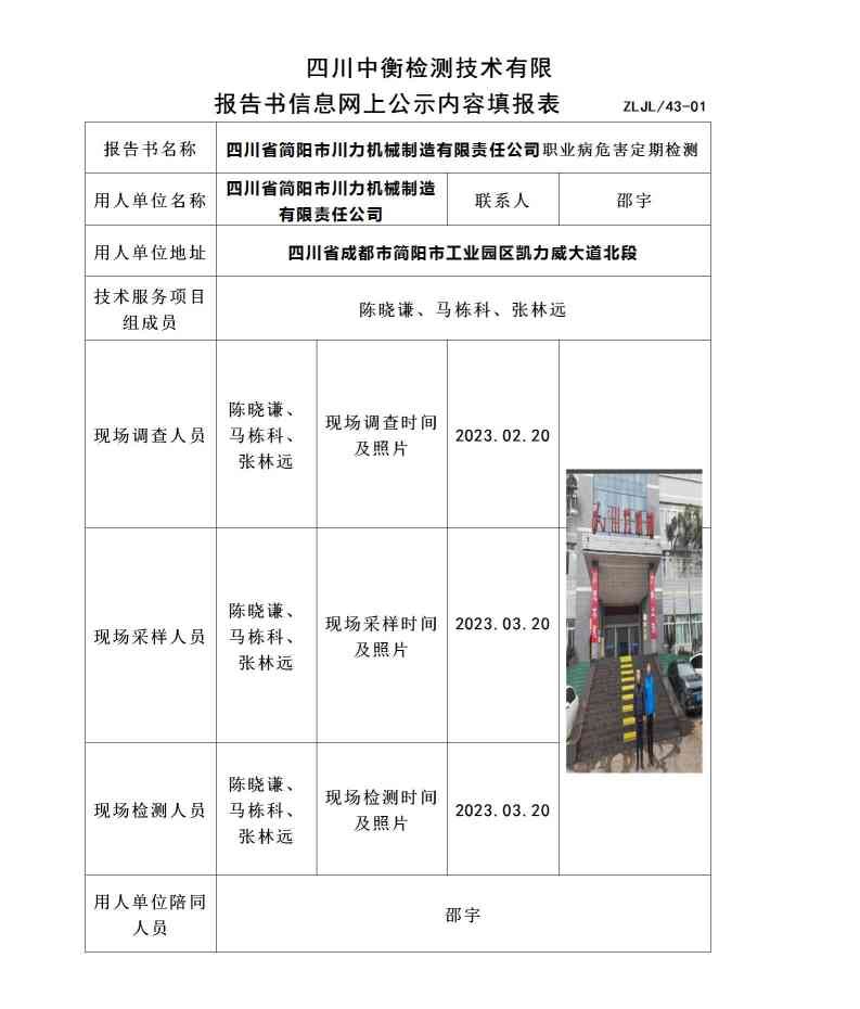 四川省简阳市川力机械制造有限责任公司职业病危害定期检测