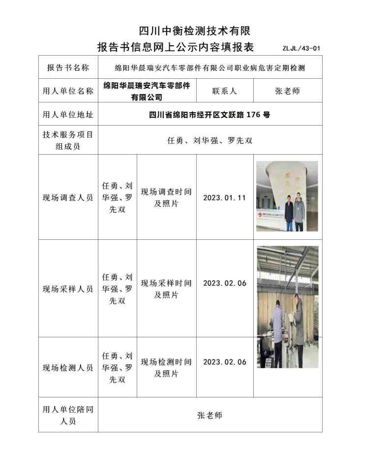 绵阳华晨瑞安汽车零部件有限公司职业病危害定期检测