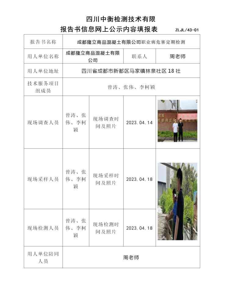 成都隆立商品混凝土有限公司职业病危害定期检测