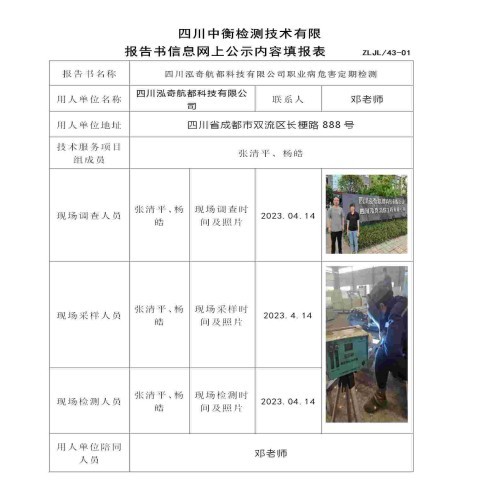 四川泓奇航都科技有限公司职业病危害定期检测