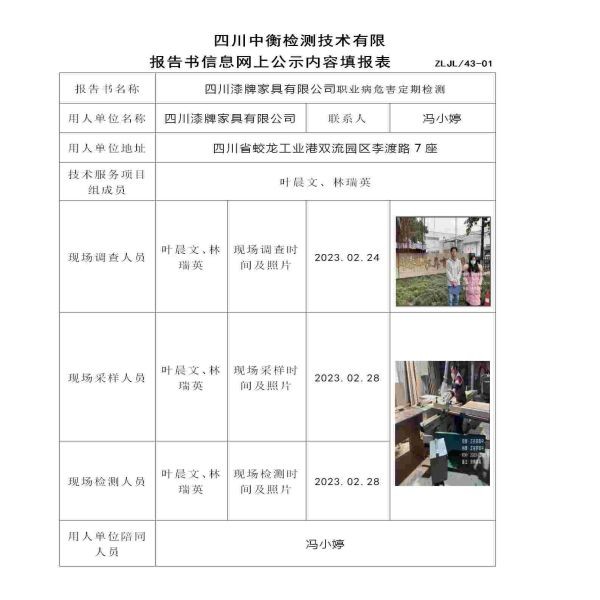 四川漆牌家具有限公司职业病危害定期检测
