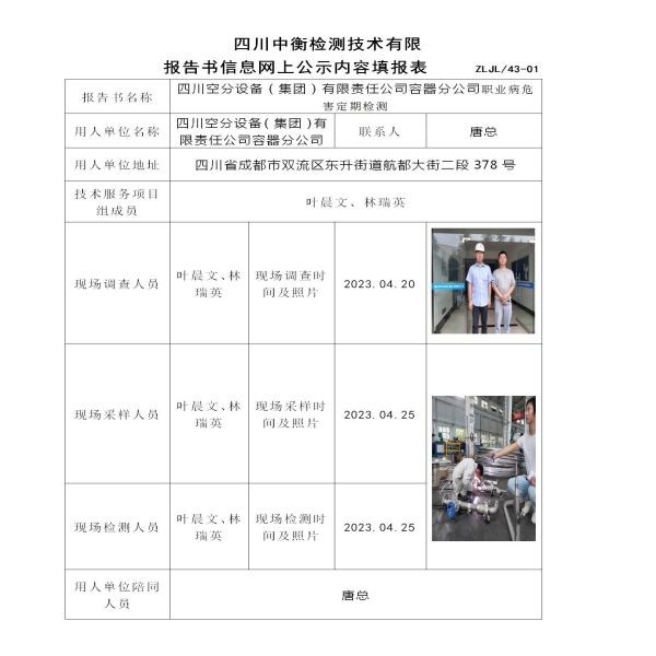 四川空分设备(集团)有限责任公司容器分公司职业病危害定期检测