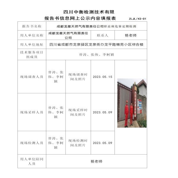 成都龙星天然气有限责任公司职业病危害定期检测