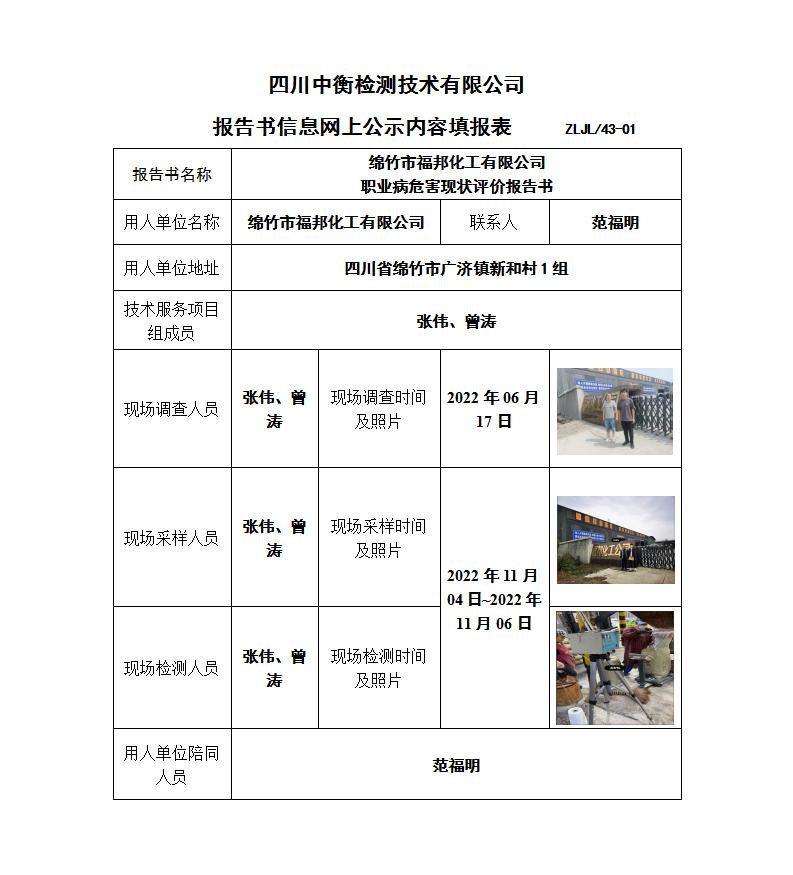 绵竹市福邦化工有限公司 职业病危害现状评价
