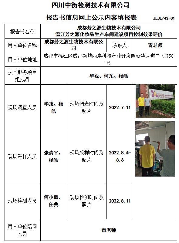 成都芳之源生物技术有限公司 温江芳之源化妆品生产车间建设项目控制效果评价