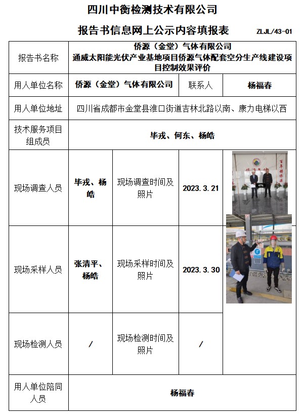 侨源(金堂)气体有限公司 通威太阳能光伏产业基地项目侨源气体配套空分生产线建设项目控制效果评价