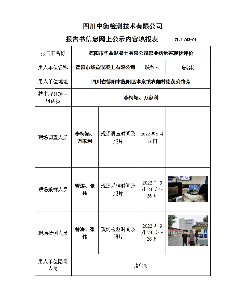德阳市华益混凝土有限公司 职业病危害现状评价报告书