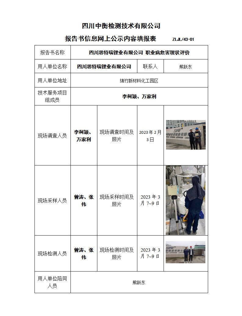 四川思特瑞锂业有限公司 职业病危害现状评价报告书