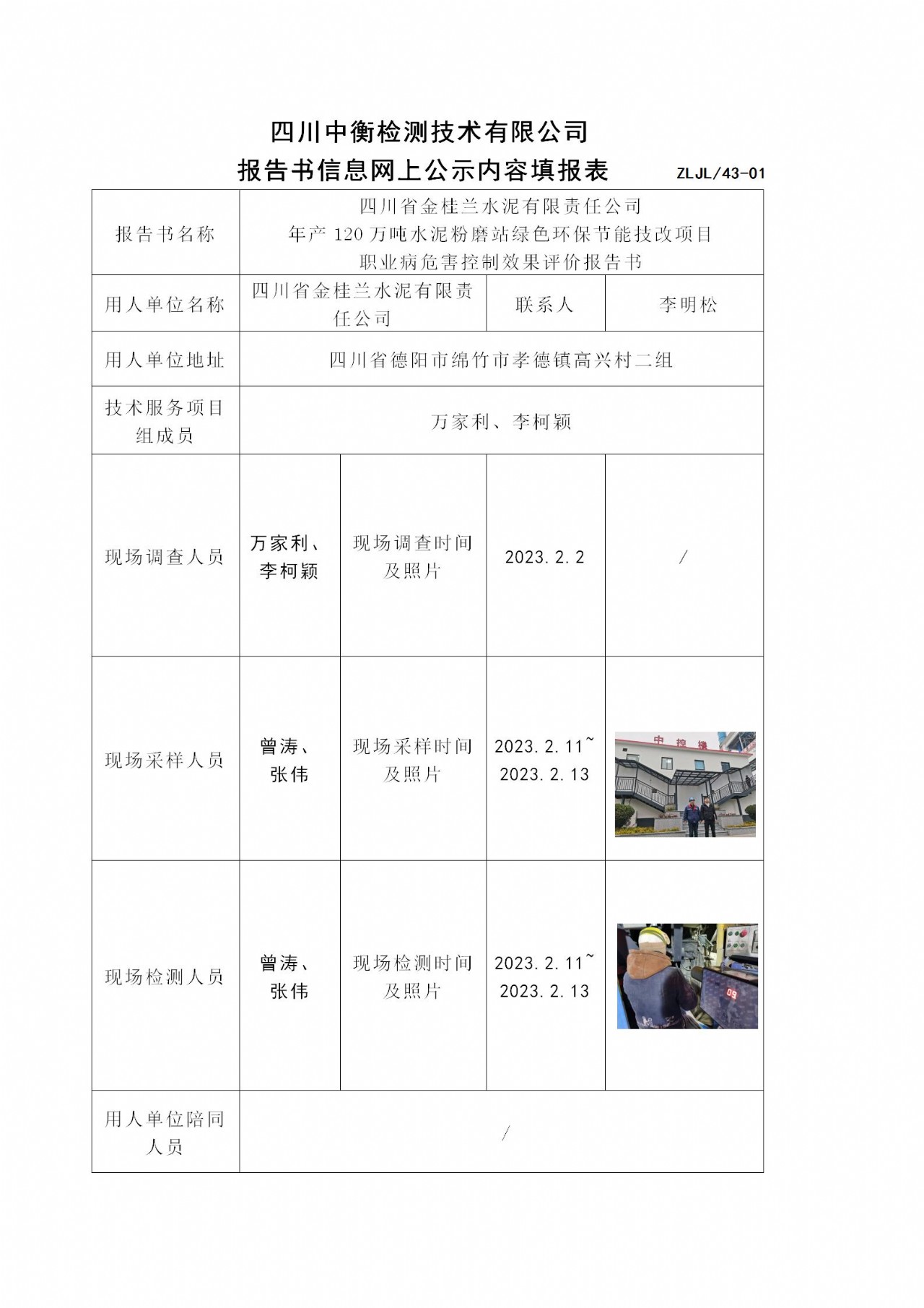 四川省金桂兰水泥有限责任公司 年产120万吨水泥粉磨站绿色环保节能技改项目 职业病危害控制效果评价