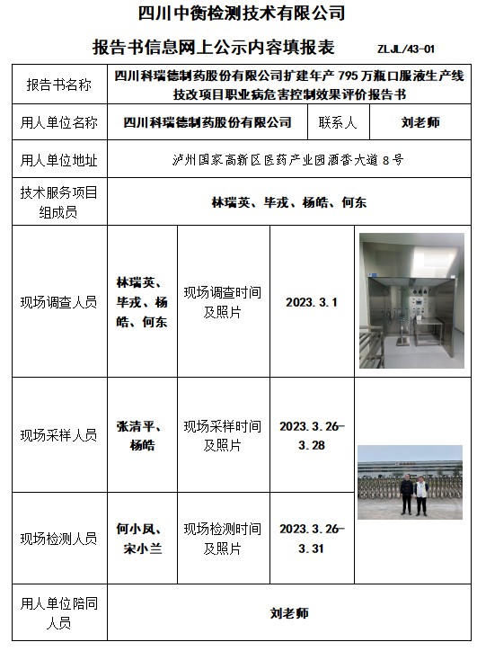 四川科瑞德制药股份有限公司扩建年产795万瓶口服液生产线技改项目职业病危害控制效果评价报告书