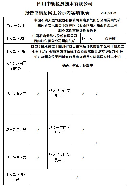 中国石油天然气股份有限公司西南油气田分公司蜀南气矿 威远页岩气田自205井区(西南区块)地面骨架工程 职业病危害预评价报告书