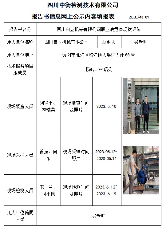 四川自立机械有限公司职业病危害现状评价