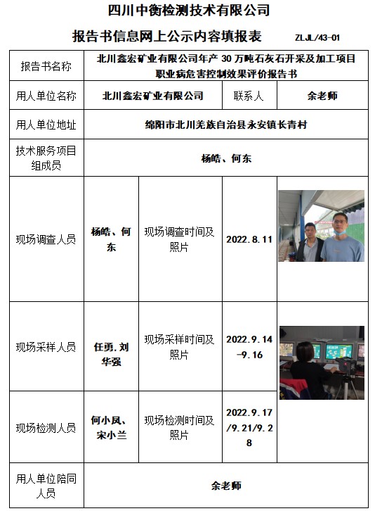 北川鑫宏矿业有限公司年产30万吨石灰石开采及加工项目职业病危害控制效果评价报告书