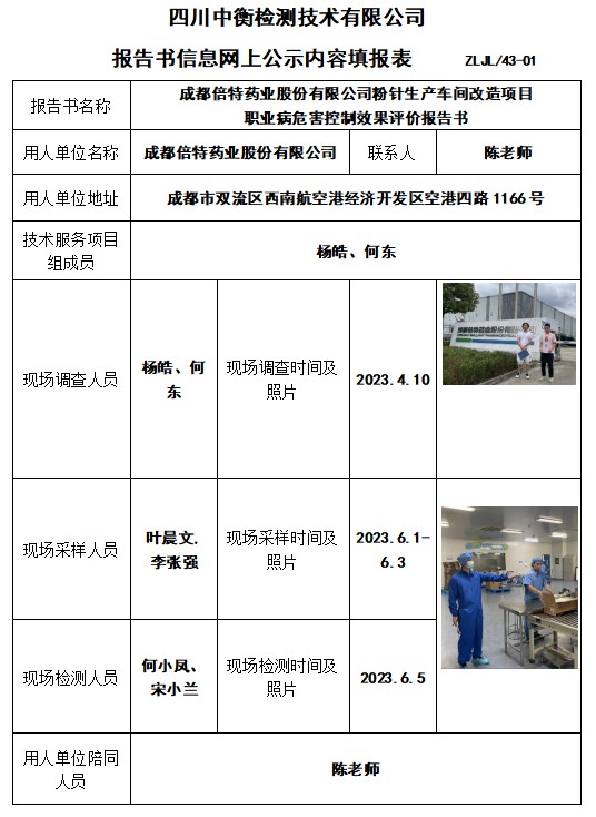 成都倍特药业股份有限公司粉针生产车间改造项目 职业病危害控制效果评价报告书