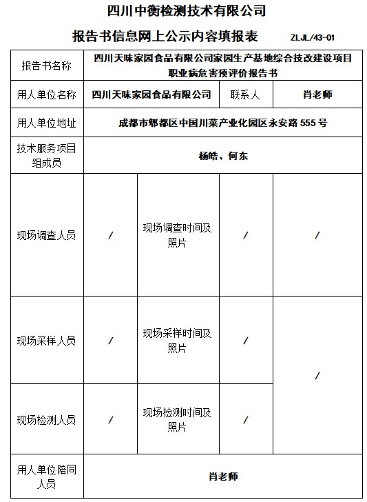 四川天味家园食品有限公司家园生产基地综合技改建设项目职业病危害预评价报告书