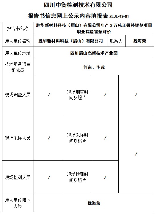胜华新材料科技(眉山)有限公司年产2万吨正极补锂剂项目职业病危害预评价