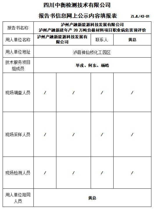 泸州产融新能源科技发展有限公司 泸州产融新建年产20万吨负极材料项目职业病危害预评价