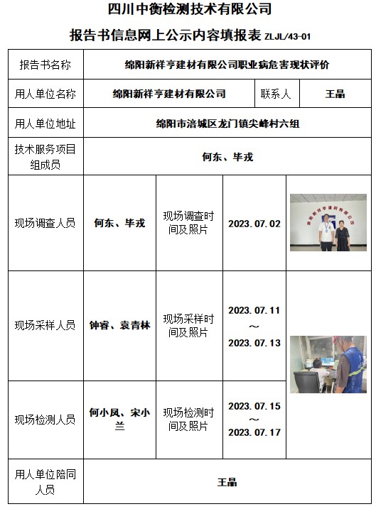 绵阳新祥亨建材有限公司职业病危害现状评价